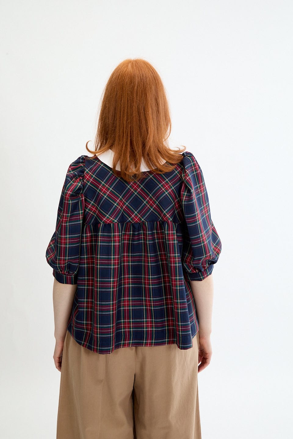 Navy plaid is back - meet Chloe! A fresh take on our Evie Blouse, Chloe is made slightly shorter with a white peter pan collar, dainty flower buttons, and classic Eliza Faulkner puff sleeves. Dress her up with a skirt and boots, or wear her with your favourite jeans.