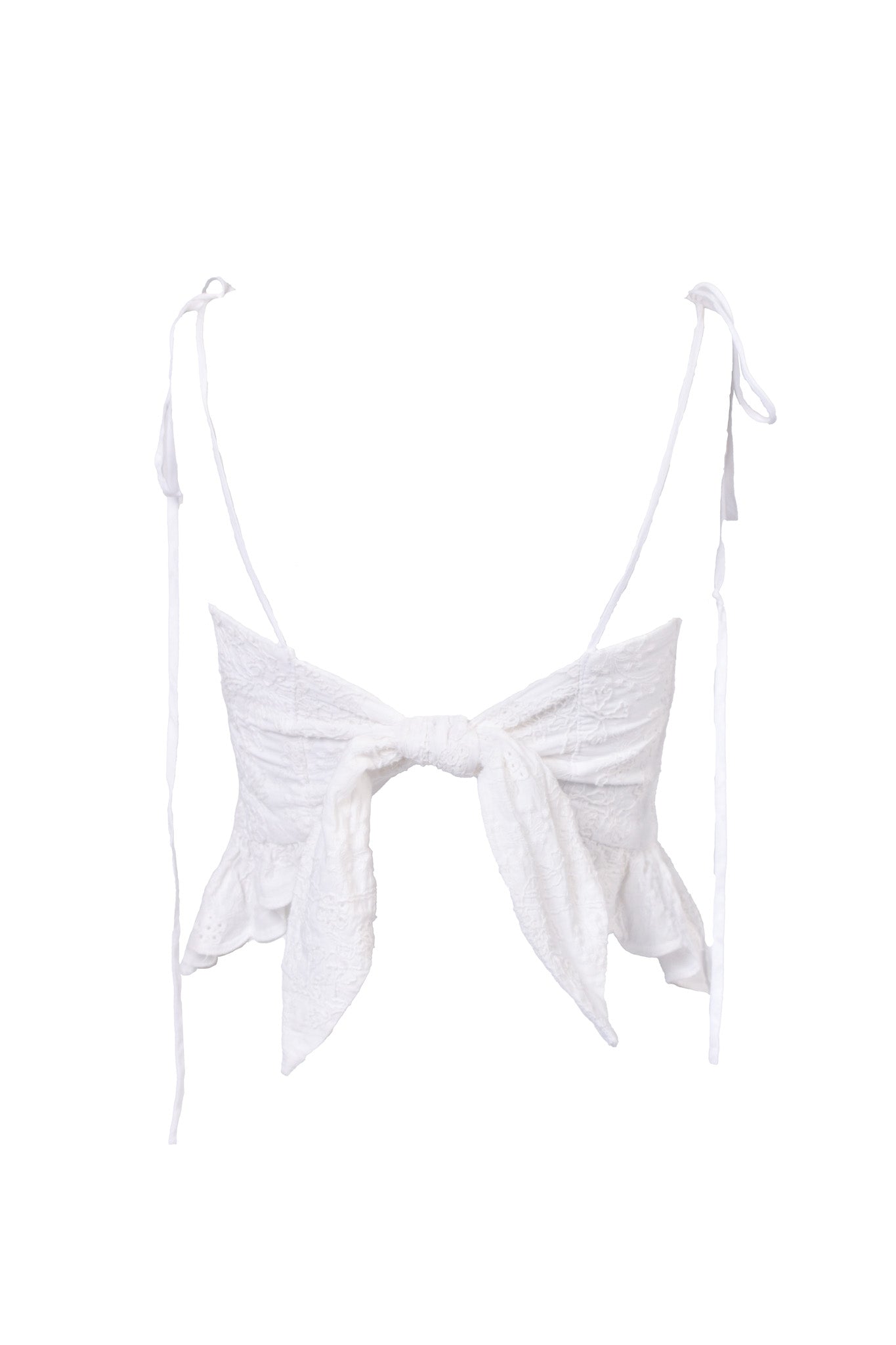 The Candy is made from white cotton eyelet, features a scalloped peplum frill, and has adjustable back and shoulder ties for ultimate adjustability. Dress it up with jeans, skirts, or even a tulle dress.